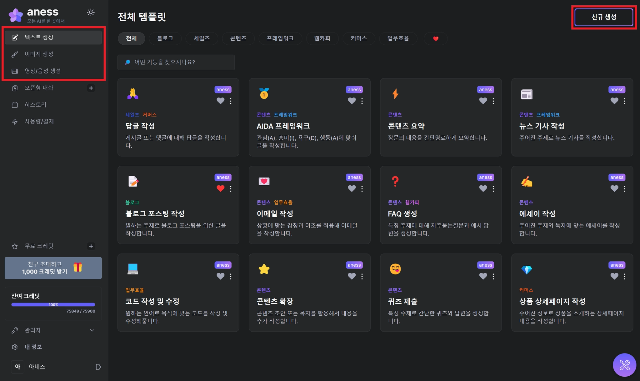 현재는 텍스트형 결과물을 만드는 템플릿만 생성 가능하며, 추후 이미지 및 영상/음성을 만드는 템플릿도 생성할 수 있도록 업데이트 예정입니다.