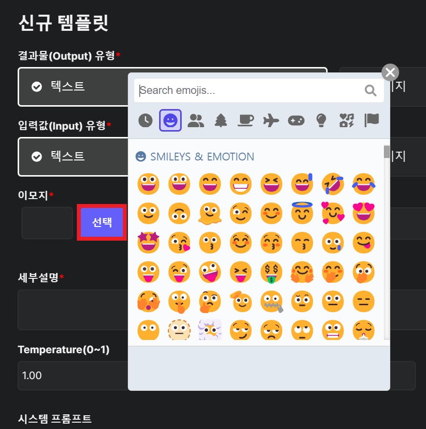 다음으로 이모지 입력란에서 [선택] 버튼을 눌러 템플릿에 노출될 이모지를 선택합니다. 이모지는 오른쪽 이미지와 같은 위치에서 다른 사용자들에게 보이게 됩니다.