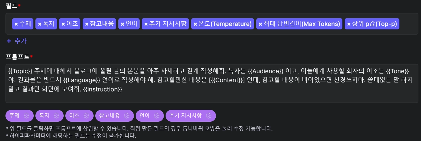 마지막으로 사용자가 정보를 입력할 수 있는 ‘필드’를 선택하고, 해당 필드를 활용해 AI에게 보낼 ‘프롬프트’를 작성합니다. 필드를 선택하면 ‘프롬프트’ 입력란 하단에 보라색으로 필드가 뜨게 되는데, 이 부분을 클릭하면 프롬프트 내 해당 필드가 {{Topic}}, {{Audience}} 와 같은 식으로 삽입됩니다.