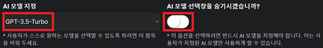 그리고 이렇게 AI 모델을 지정할 경우, 우측의 토글(Toggle) 버튼을 클릭해 템플릿을 사용하는 사용자에게 AI 모델 선택창 자체를 보이지 않게 숨길 수 있습니다.