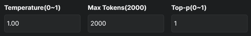 다음으로 텍스트 생성형 AI에서 광범위하게 사용되는 하이퍼파라미터(Hyperparameter) 3가지의 기본값을 입력해주어야 합니다.