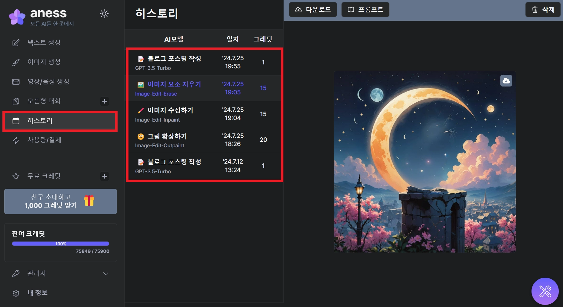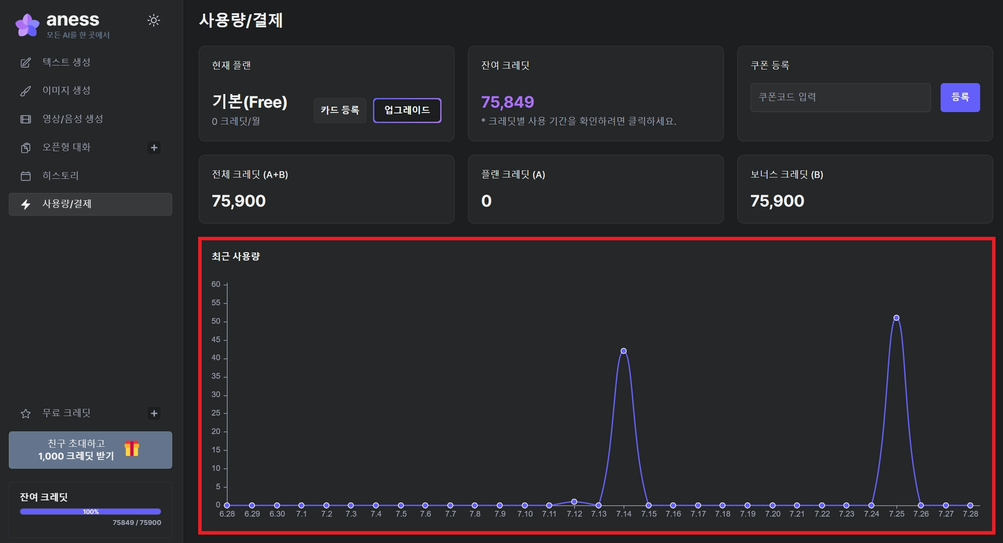 [사용량/결제] 화면 하단에 보이는 ‘최근 사용량’ 차트를 클릭해도 위와 같이 동일하게 [히스토리] 페이지로 이동할 수 있습니다.