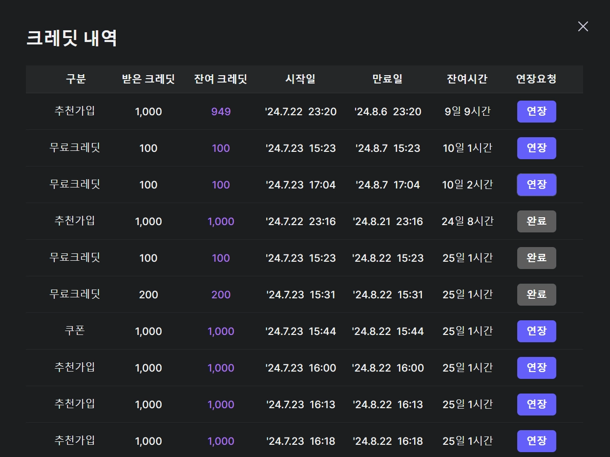 크레딧 획득 내역 확인 창에서는 각 크레딧을 언제 어떻게 획득하게 되었는지, 얼마나 사용했는지, 남은 유효기간은 얼마인지 한 눈에 볼 수 있습니다.