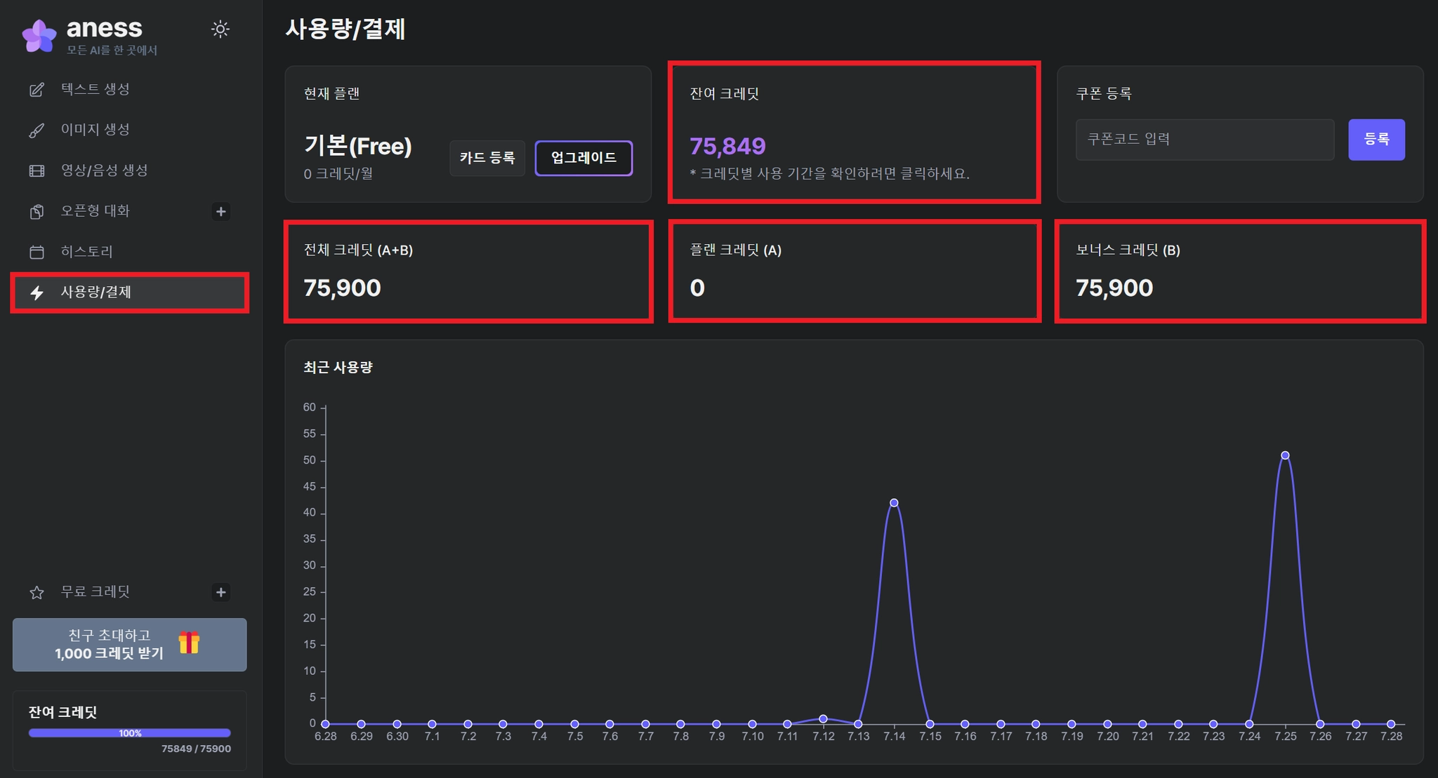 크레딧은 정기 결제를 통해 획득한 ‘플랜 크레딧’과 쿠폰 및 미션을 통해 획득한 ‘보너스 크레딧’으로 구분됩니다.