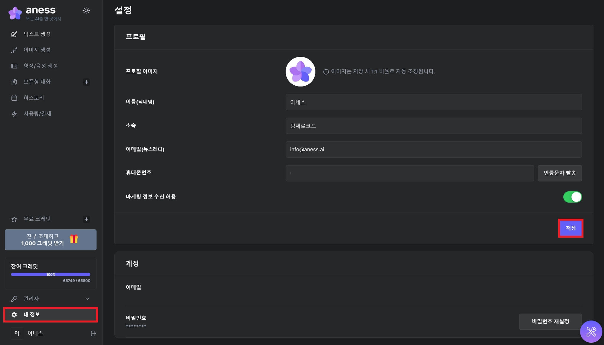 휴대폰번호 : 문자 인증을 통해 휴대폰번호를 등록할 수 있으며 한 번 등록된 휴대폰 번호는 변경할 수 없습니다. (반드시 변경해야 할 경우 info@aness.ai로 요청해주세요.)