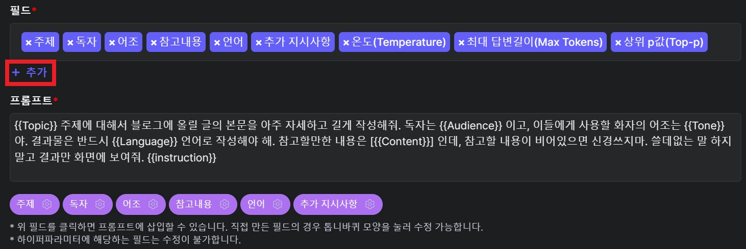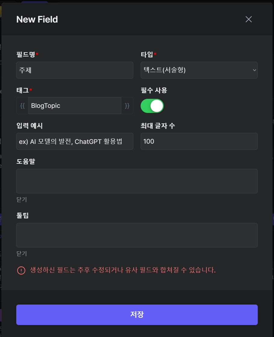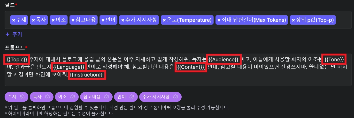 태그 : 해당 필드가 프롬프트에 삽입될 때 표시되는 방식이며, 사용자에게는 노출되지 않고 템플릿을 제작하는 제작자만 볼 수 있습니다. 태그는 반드시 영어로 작성해야 합니다.