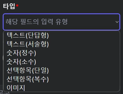 타입 : 필드에 내용을 입력하는 방식을 지정할 수 있습니다.