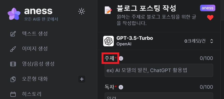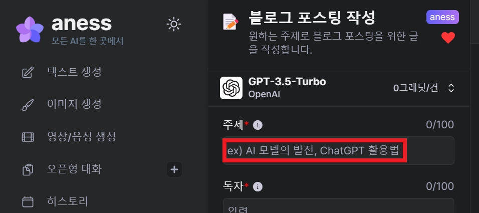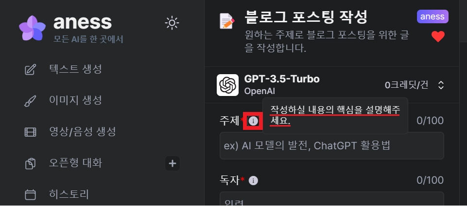 예를 들어, ‘문체’ 또는 ‘어조’와 같은 필드의 경우 사용자가 어떤 내용을 입력해야 할지 모를 수 있기 때문에 선택항목(단일) 타입으로 만들어서 준비된 선택지 중에서 하나를 고르도록 하는 것이 좋습니다.