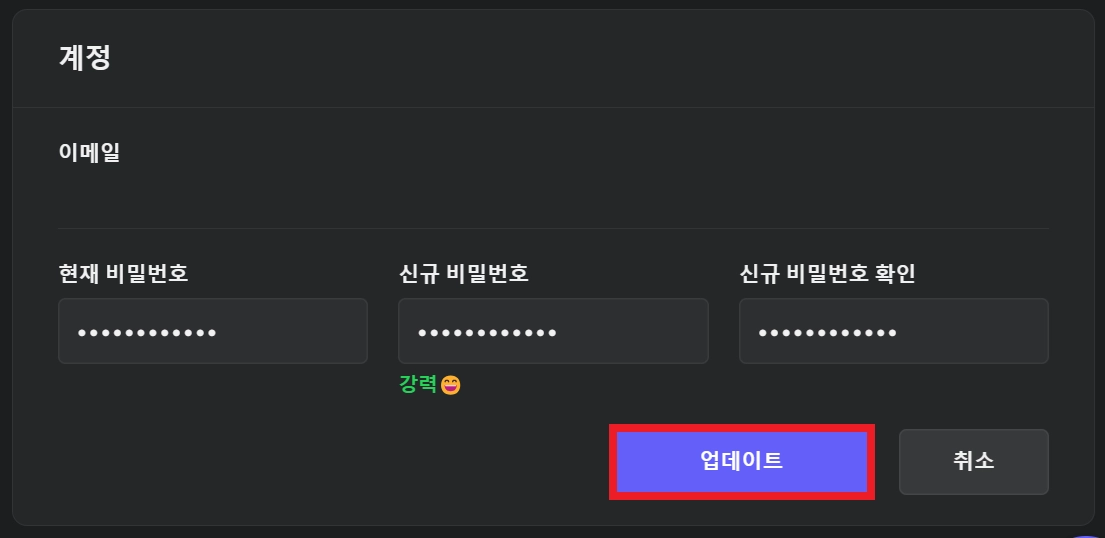 현재 비밀번호 및 신규 비밀번호를 입력하고 [업데이트] 버튼을 누르면 변경이 완료됩니다.