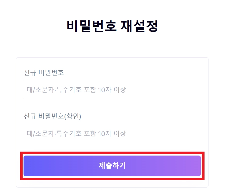원하는 비밀번호를 입력한 후 [제출하기] 버튼을 누르면 재설정이 완료됩니다.