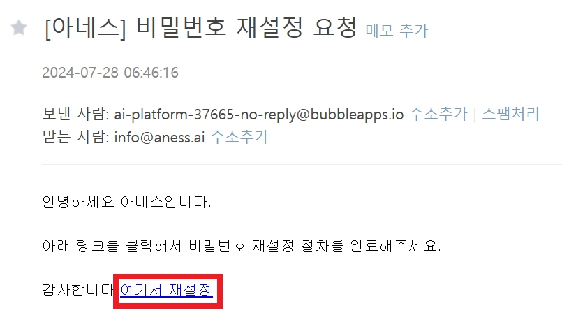 아래와 같이 비밀번호 재설정 이메일을 받았다면 메일 본문의 [여기서 재설정] 링크를 클릭합니다.