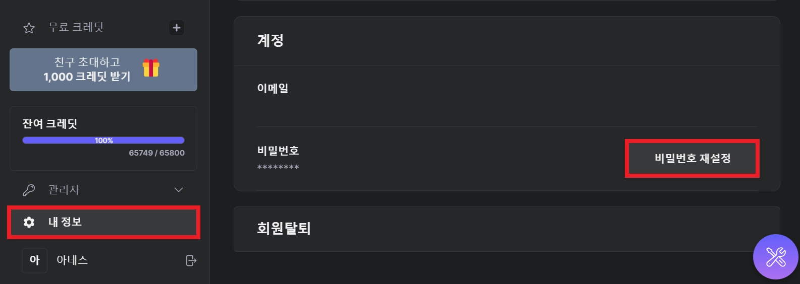 대시보드에서 좌측 하단에 위치한 [내 정보] 메뉴로 들어가 [비밀번호 재설정] 버튼을 누릅니다.