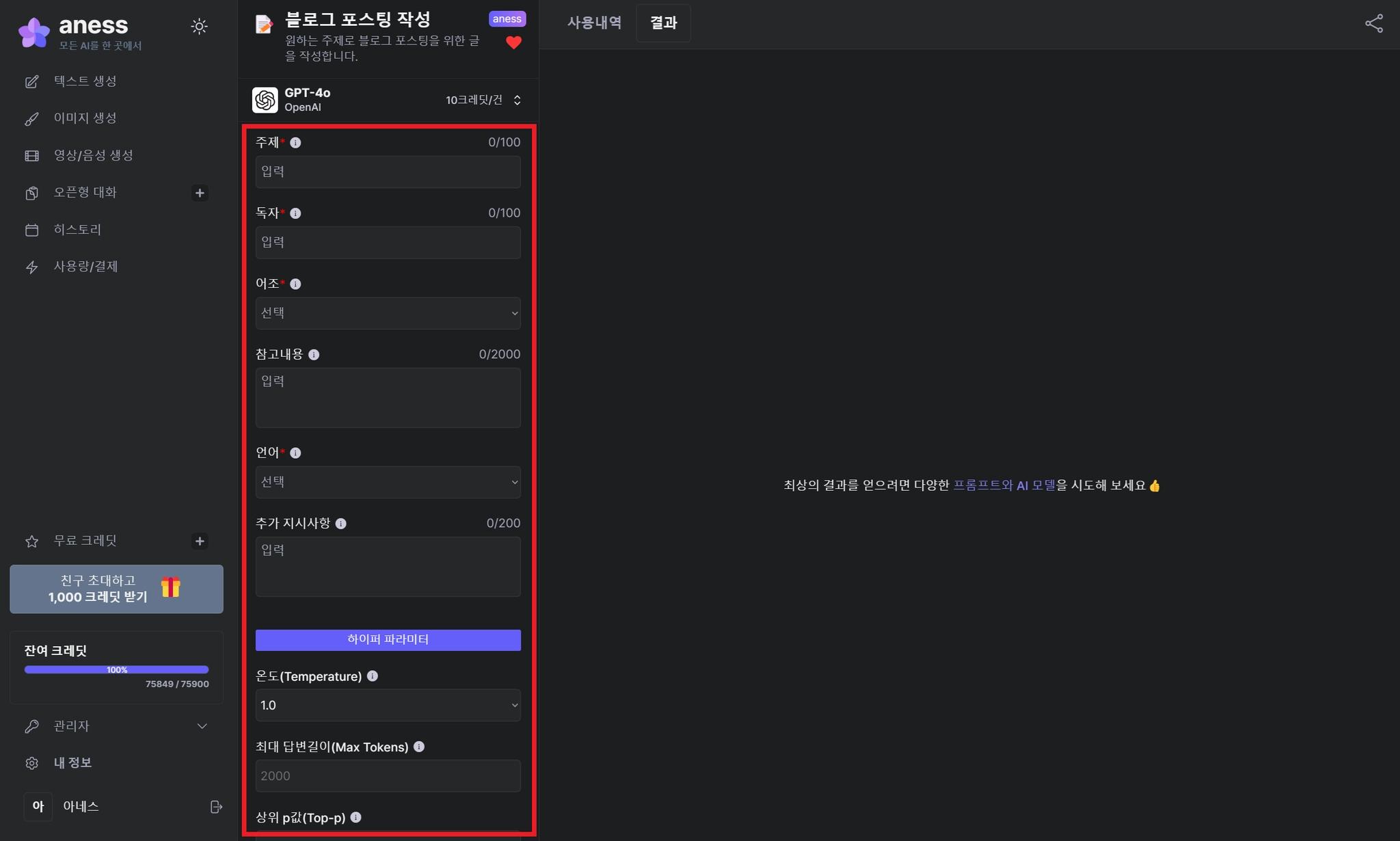 AI 모델을 선택하면 아래와 같이 해당 템플릿을 사용하기 위해 입력해야 할 필드들이 화면에 나타납니다.