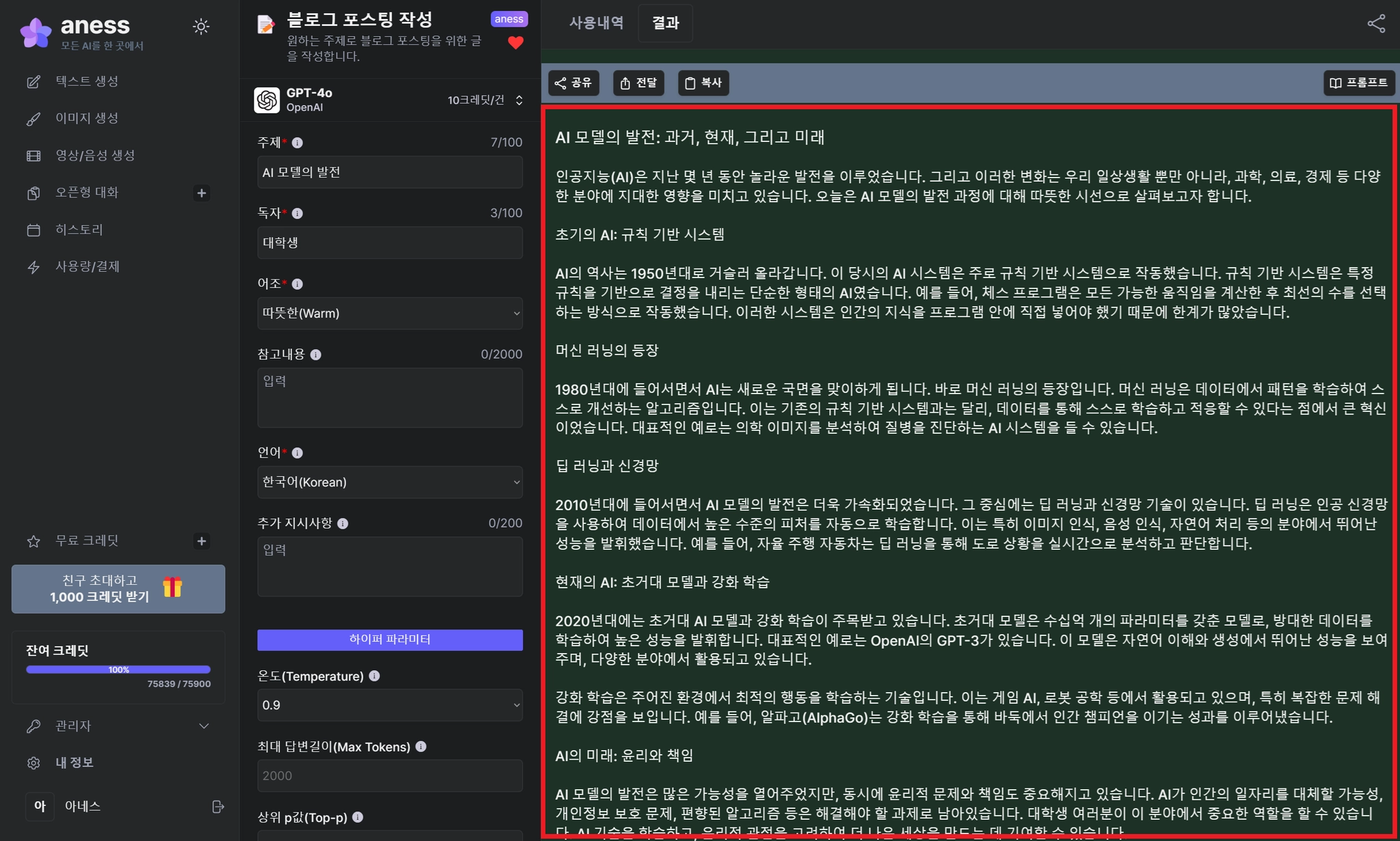 약간의 대기시간을 거친 후, 생성이 완료되면 우측에서 결과물을 확인할 수 있습니다.