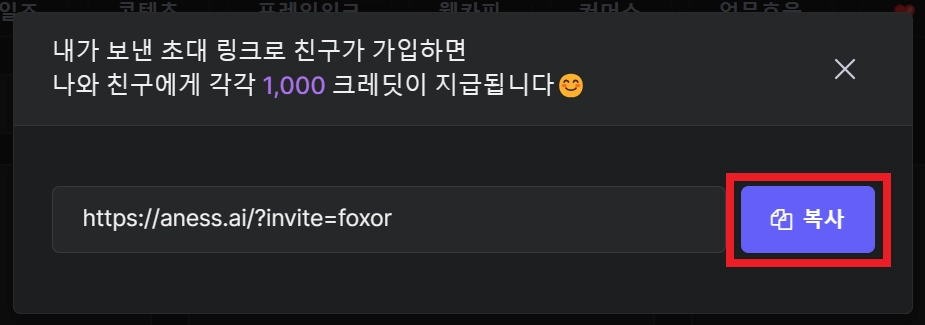 친구가 복사된 초대 링크를 클릭해 회원 가입을 하면 (이메일 인증까지 완료) 즉시 1,000 크레딧이 지급됩니다.